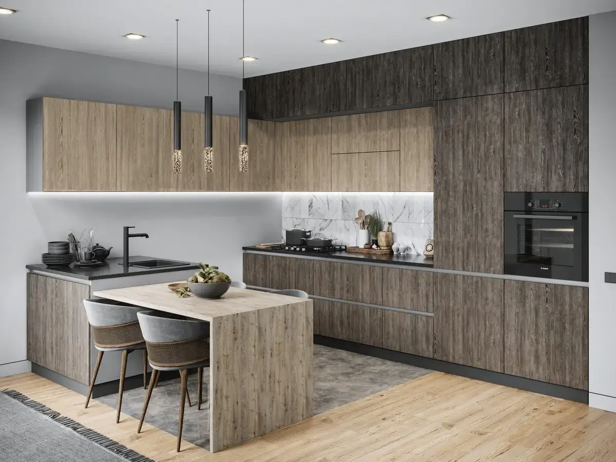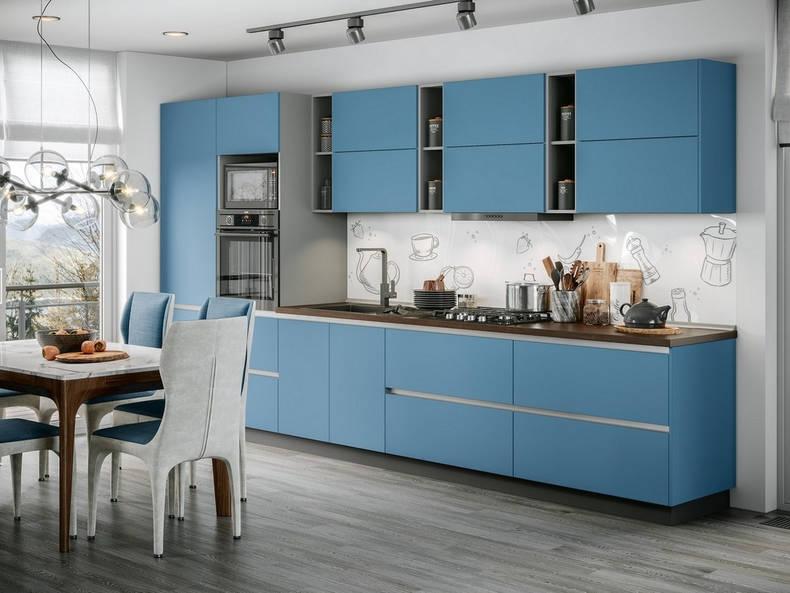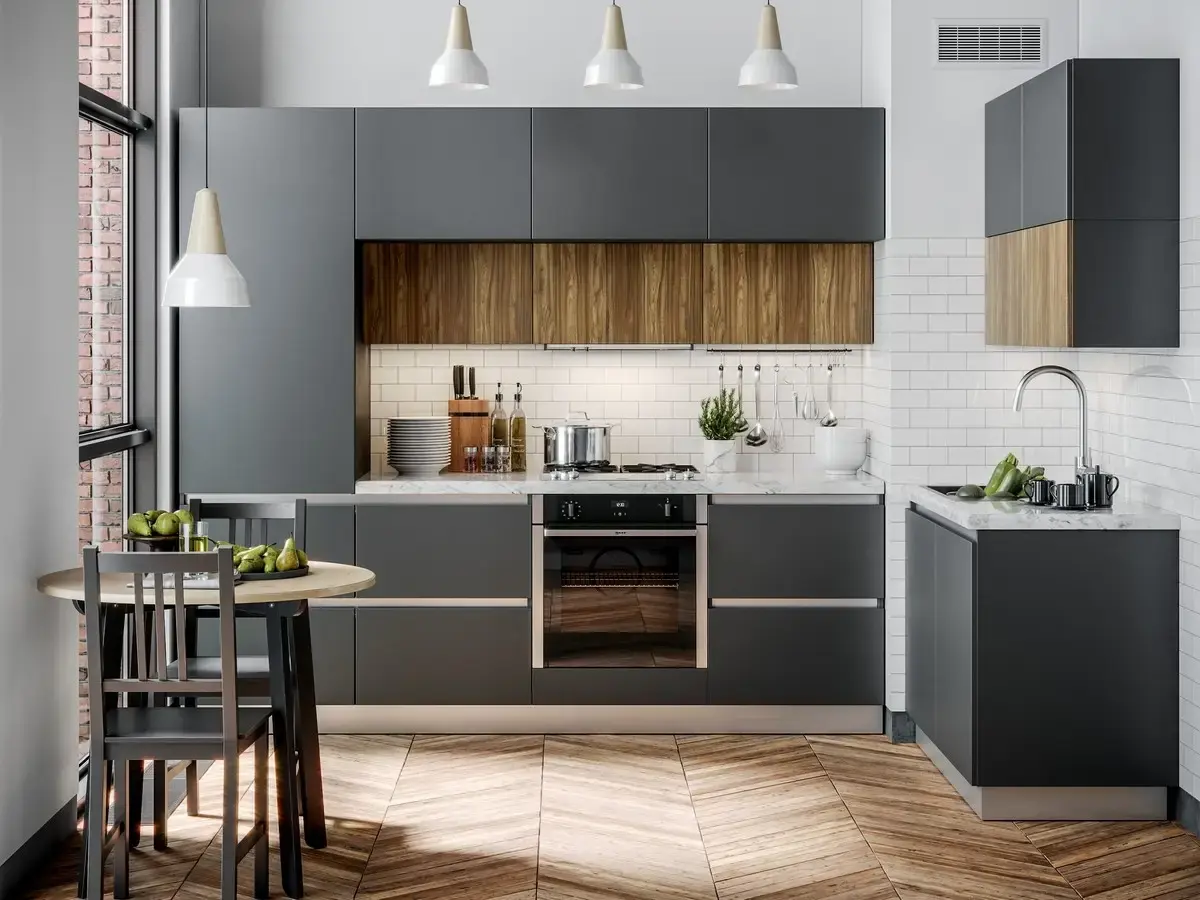 Современная кухня, где каждая деталь работает на ваш комфорт Никаких лишних деталей, только чистые линии и функциональность. Фасады этой модели не нуждаются в традиционных ручках- их роль играет элегантный алюминиевый профиль, встроенный в корпус. Это не просто трендовое решение, но и серьезный шаг к безопасности, особенно если в доме есть дети