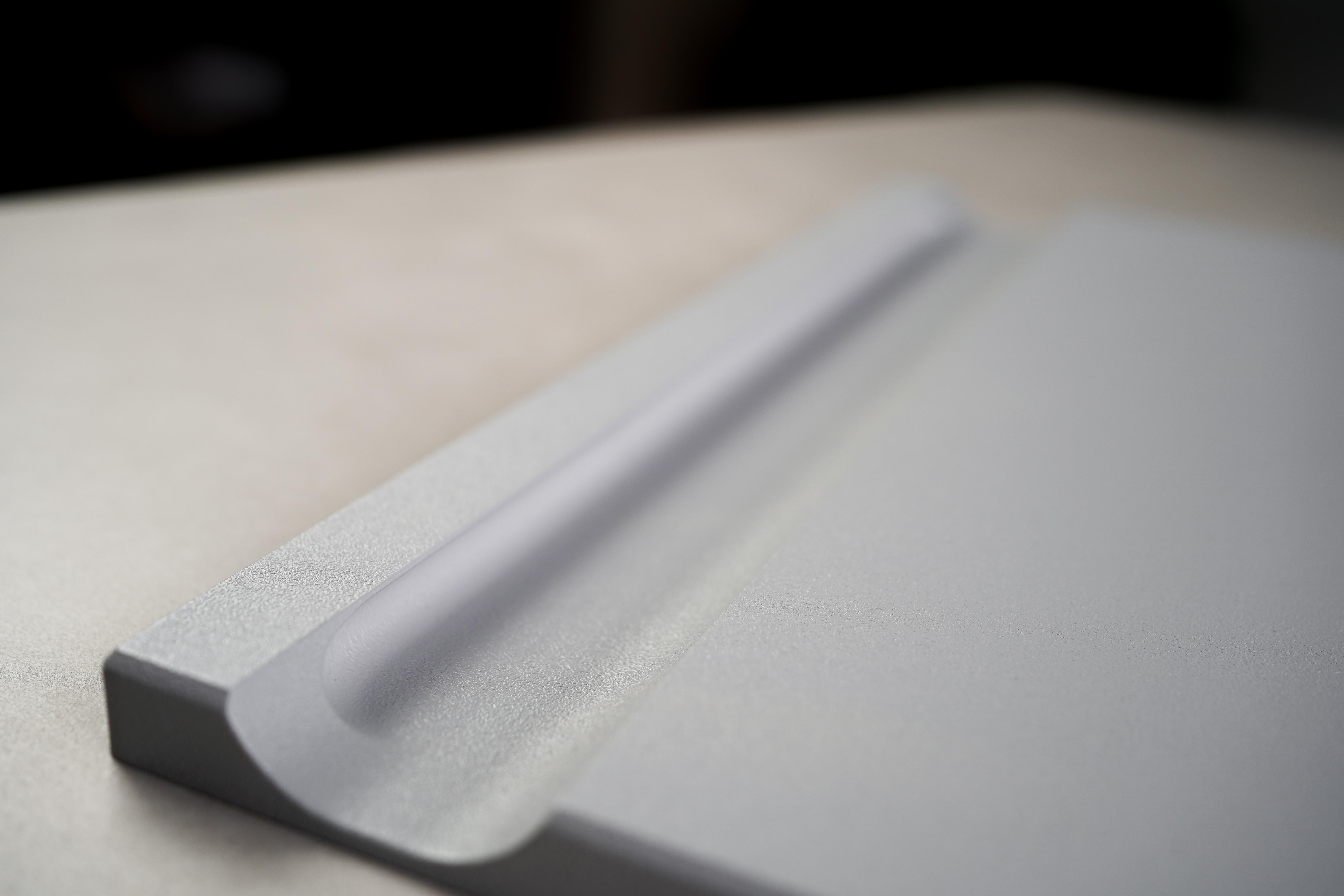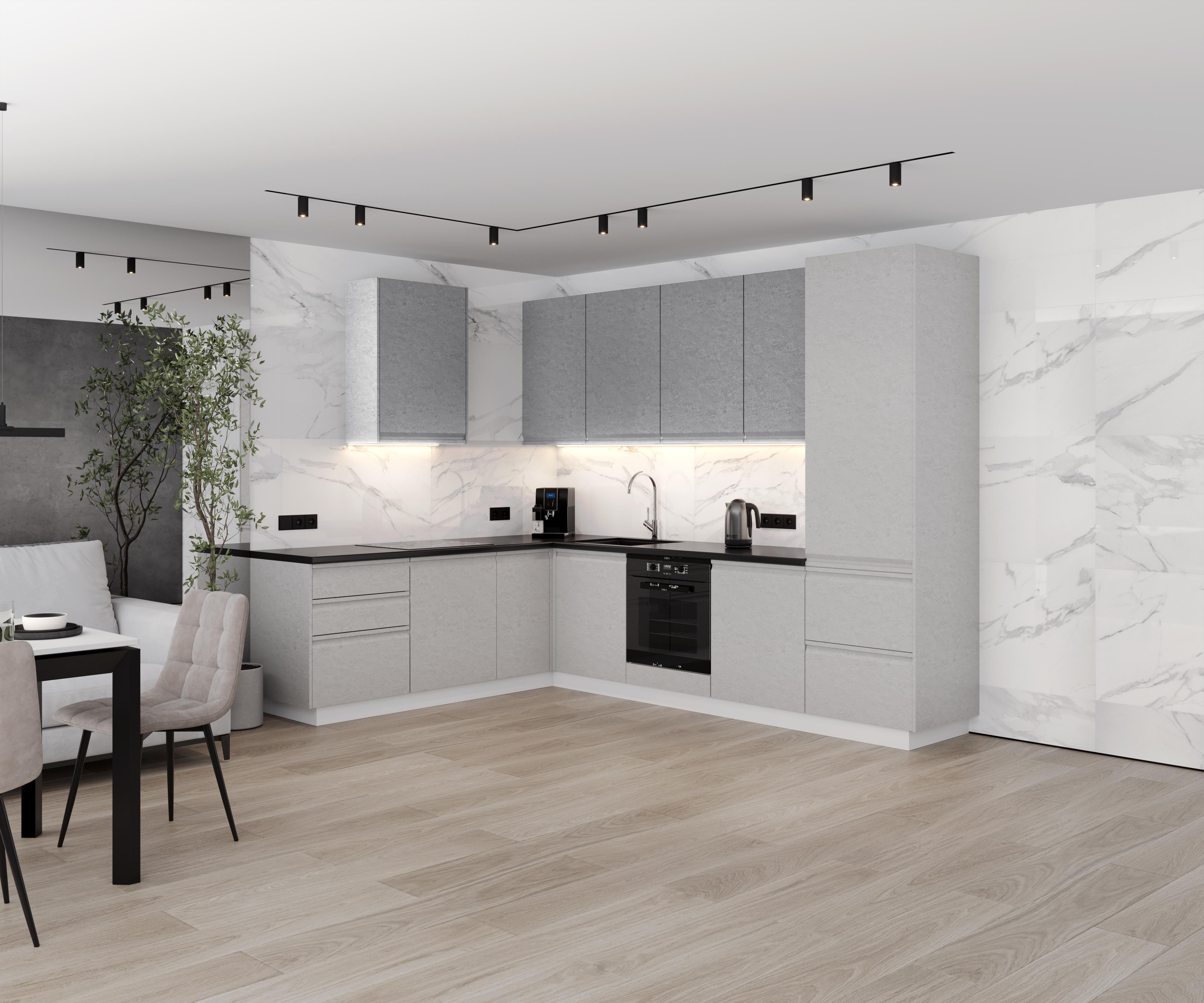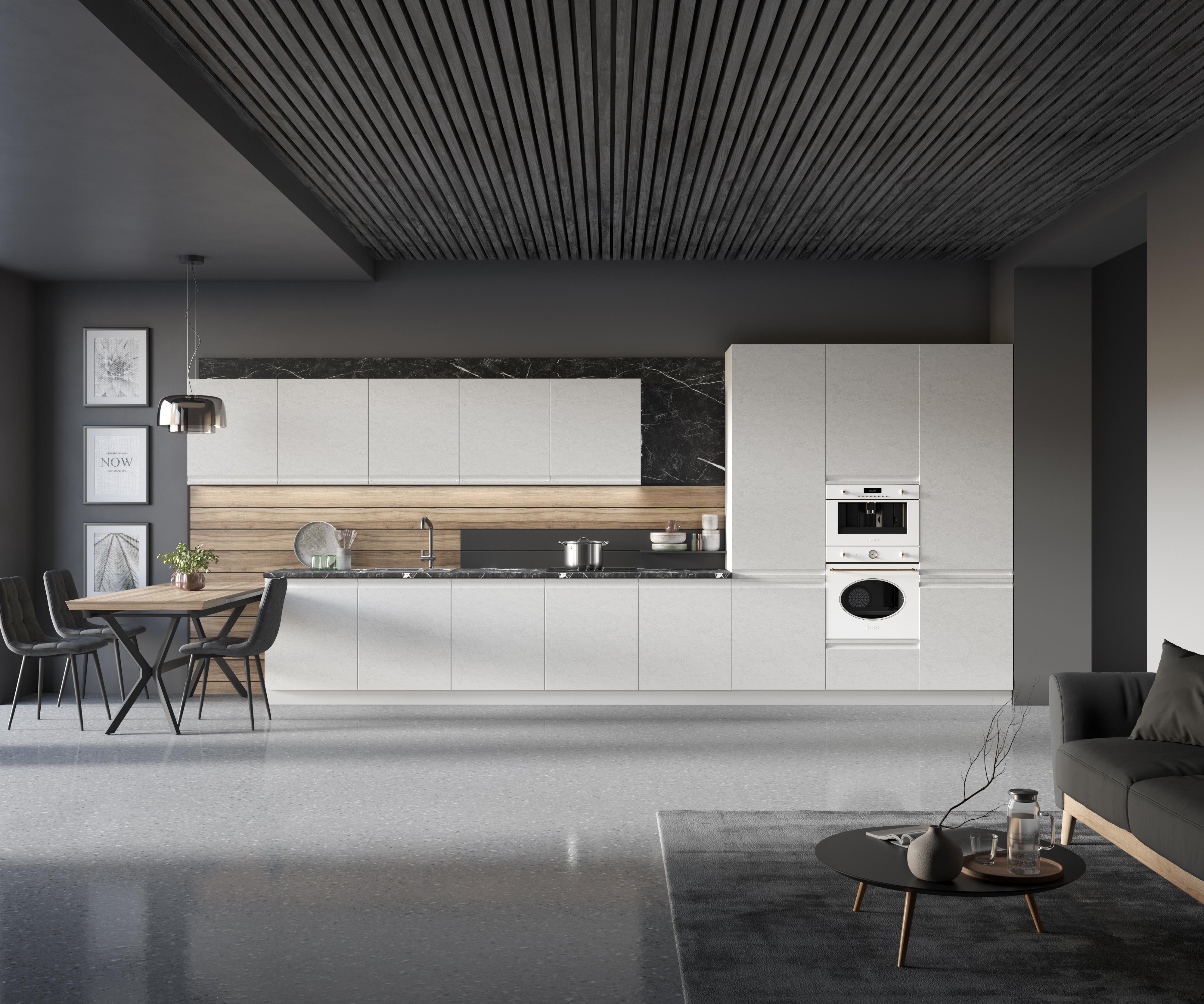 «Ирис» – коллекция, в которой лаконичность форм встречается с инновационными решениями. Отличительной чертой коллекции является ручка, которая плавно интегрирована в верхний торец фасада, формируя безупречно гладкую поверхность. Интегрированные ручки не только обеспечивают удобный захват, но и служат изящным декоративным элементом. Фактурная пленка придает кухне дополнительную глубину и характер. Она создает игру света и тени, подчеркивая линии и формы.